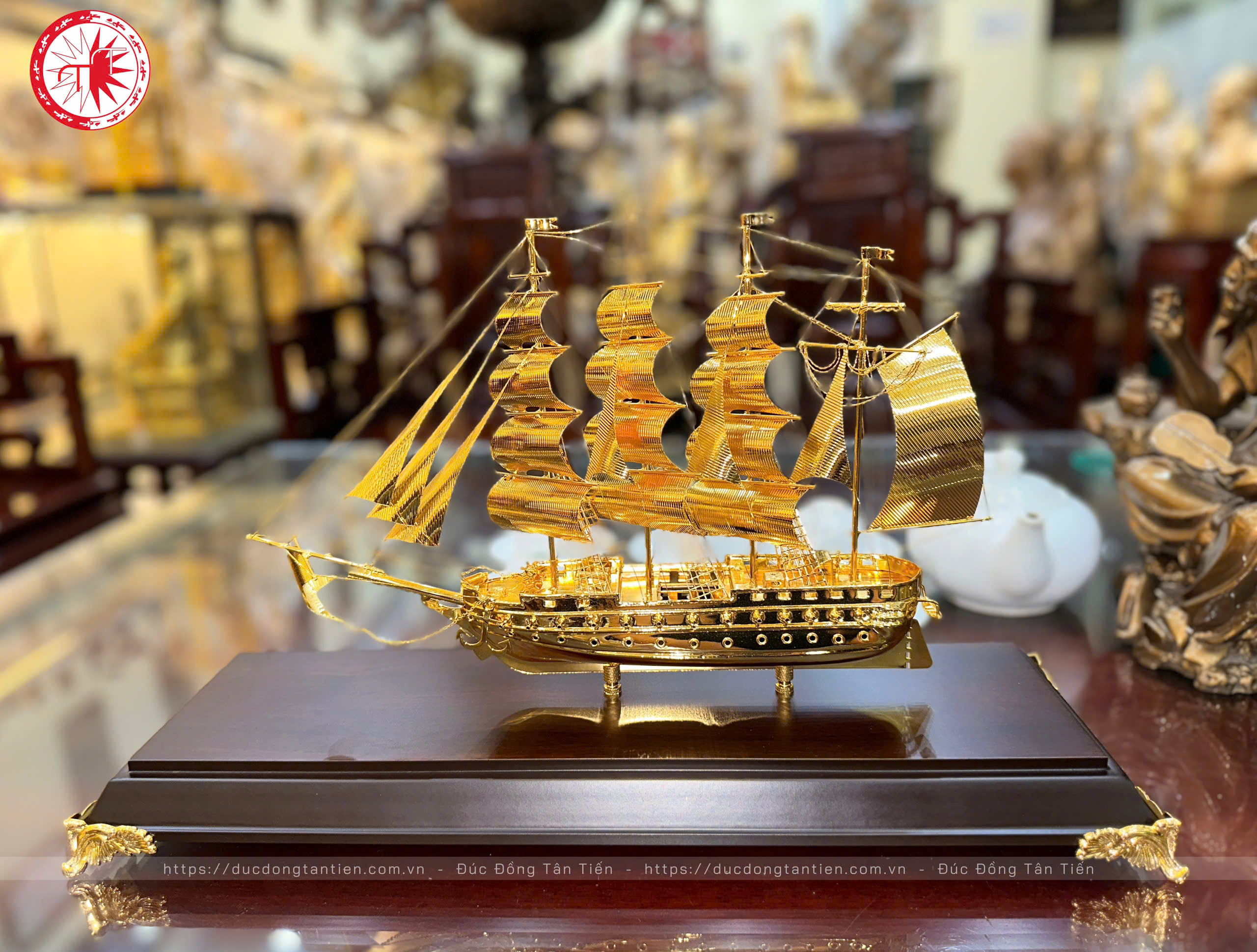 Mô hình thuyền buồm dát vàng 24K mang thiết kế sang trọng, tinh xảo, phù hợp trưng bày phòng khách, phòng làm việc, showroom hoặc làm quà tặng cao cấp. Mỗi chi tiết được gia công tỉ mỉ, dát vàng óng ánh giúp không gian nổi bật và đẳng cấp.